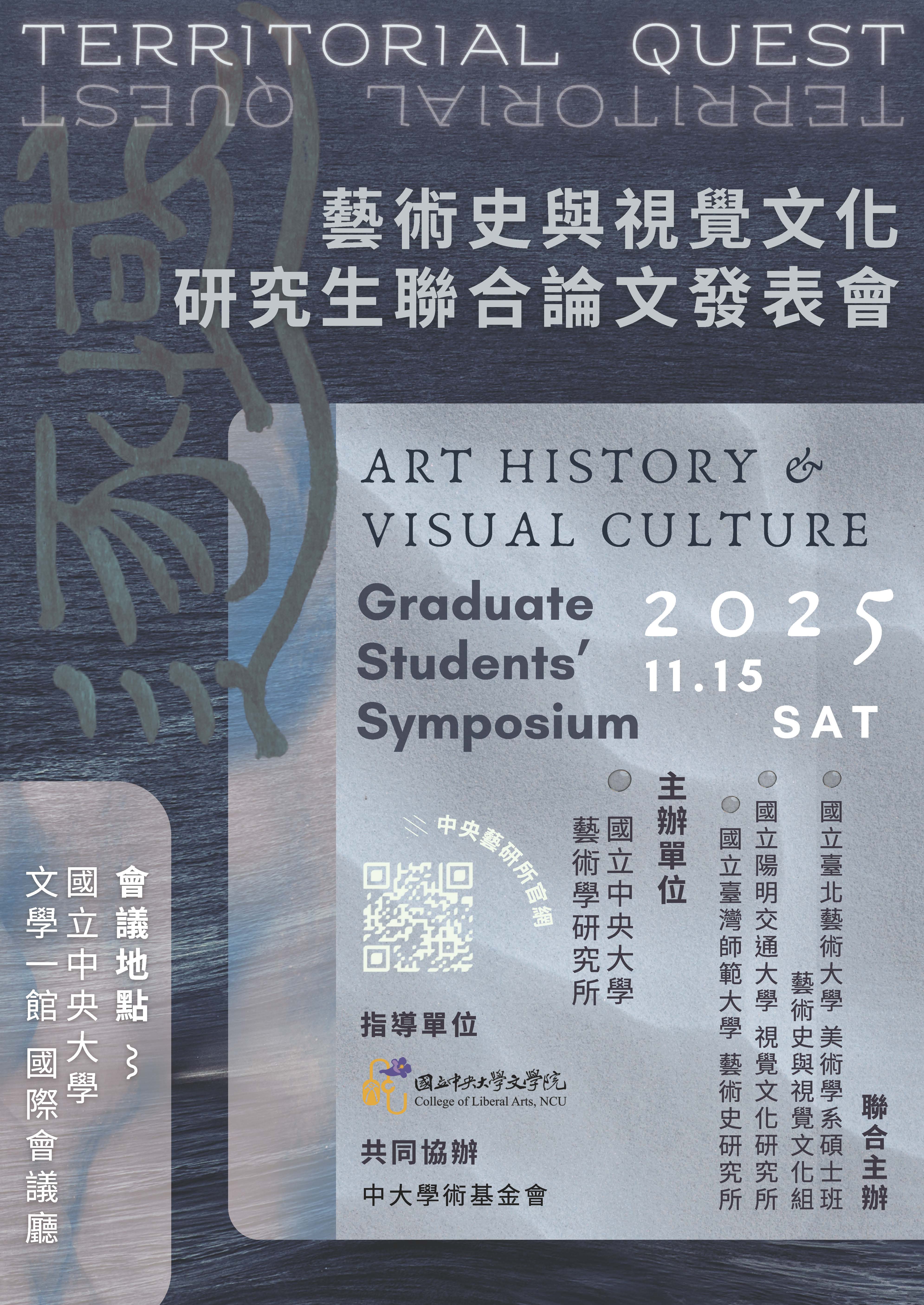 本發表會由國立中央大學藝術學研究所、國立臺灣師範大學藝術史研究所、國立臺北藝術大學美術學系碩士班藝術史與視覺文化組、國立陽明交通大學視覺文化研究所四校藝術史與視覺文化相關系所聯合主辦,期望透過跨校交流,促進藝術史與視覺文化領域的研究對話與觀點交流。