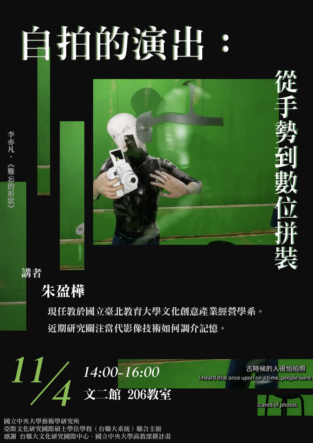 活動訊息 2025/10/13 【專題講座】自拍的演出:從手勢到數位拼裝 講題:自拍的演出:從手勢到數位拼裝講者:朱盈樺副教授(國立台北教育大學文化創意產業經濟學系)時間:2025年11月4日(二)14:00-16:00地點:中央大學文學院二館 206教室