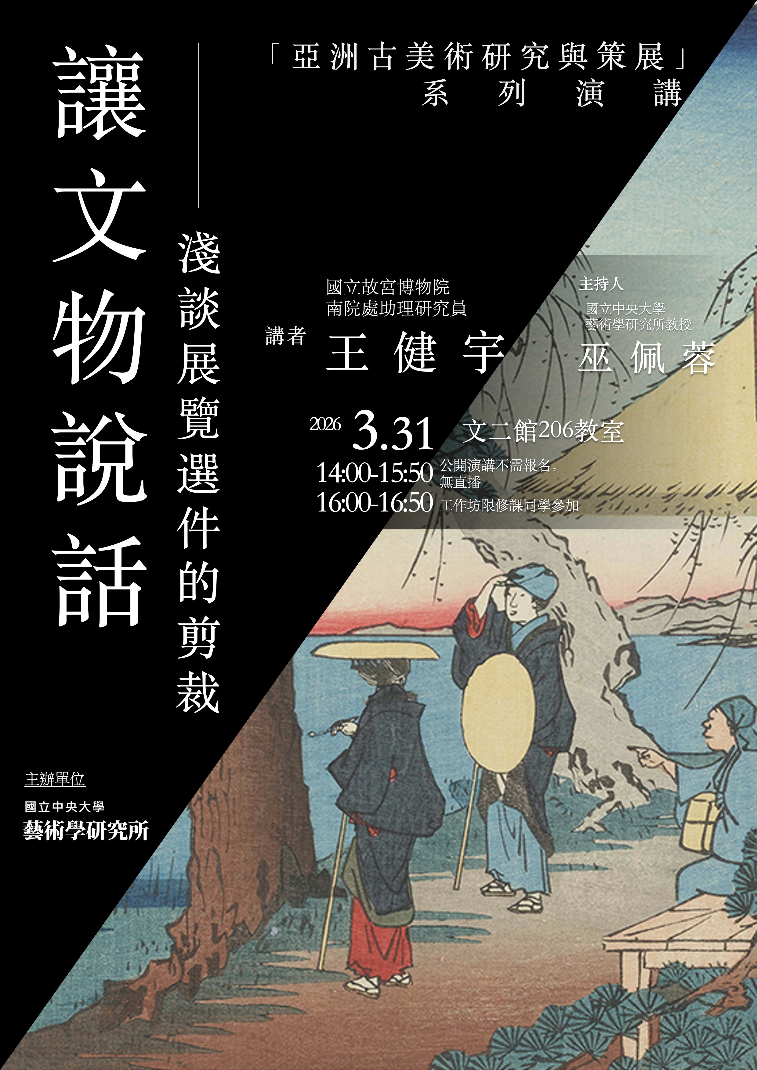 Events 2026/3/10 【專題講座】讓文物說話:淺談展覽選件的剪裁 「亞洲古美術研究與策展」系列演講3講題:讓文物說話:淺談展覽選件的剪裁講者:國立故宮博物院南院處助理研究員 王健宇主持人:巫佩蓉日期:2026年3月31日下午2點至3點50分地點:文二館206教室公開演講不需報名,無直播(4點至4點50分工作坊限修課同學參加)國立中央大學藝術學研究所主辦